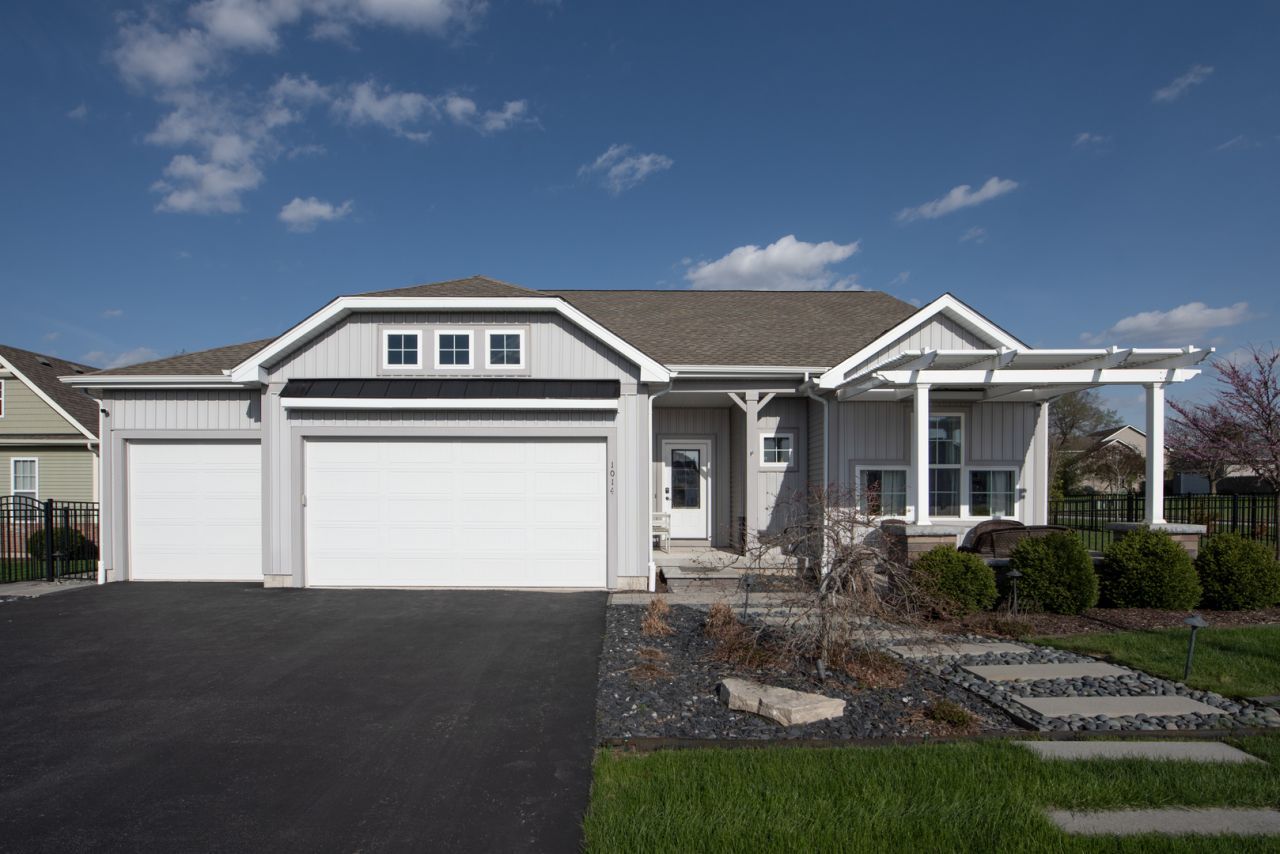 Exceptional home with a welcoming and unique front entry patio with pergola-perfect for a quaint sitting area. Inside, a thoughtfully designed open split-bedroom layout centers around a vaulted main living space with hardwood floors, seamlessly connecting the family room, dining area to the kitchen featuring stainless steel appliances, quartz countertops, island with seating and a pantry closet. Bedrooms two and three are conveniently located near a full bath, while the private primary suite offers, walk in closet, double vanity, linen closet, and walk-in shower. A functional mudroom with bench, and hooks connects to the laundry room. The heated and air-conditioned 4 car garage is a rare find, complete with mezzanine shelving & attic access for extra out of the way storage. The full basement offers an egress window and is roughed in for plumbing, providing excellent potential for future expansion. The outdoor space is equally impressive, featuring a large covered slate patio equipped with a built-in gas grill, beverage fridge, six-seat quartz bar, plus a separate lounge area. Additional highlights include a raised garden bed, a paver walkway, gas line for future heated pool and a dedicated paver pad ideal for a hot tub. The professionally landscaped, fenced corner lot creates a true backyard retreat!